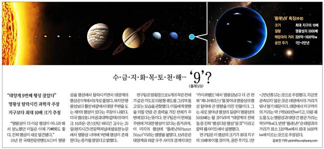 10년 전 국제천문연맹이 명왕성을 행성에서 탈락시키면서 태양계의 행성은 9개에서 8개로 줄었다. 하지만 명왕성보다 훨씬 바깥에서 태양 주변을 도는 제9의 행성이 있다는 주장이 나왔다고 경향신문은 전했다.