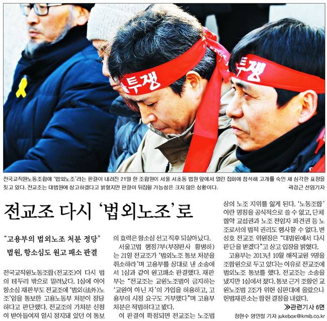 한국일보는 변성호 전국교직원노동조합 위원장이 21일 오후 서울 서초구 서울고법 앞에서 '전교조 탄압 분쇄 결의대회'를 시작하며 머리띠를 두르고 있는 장면을 싣었다. 전교조는 이날 정부에 법외노조 통보 취소를 요구하는 항소심에서 패소했다.