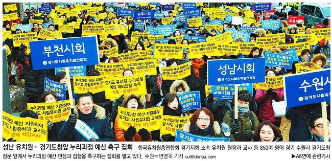동아일보, 조선일보는 한국유치원총연합회 경기지회 소속 유치원 원장과 교사 등 850여명이 경기 수원시 경기도청 정문 앞에서 누리과정 예산 편성과 집행을 촉구하는 집회를 열고 있는 모습을 담았다.