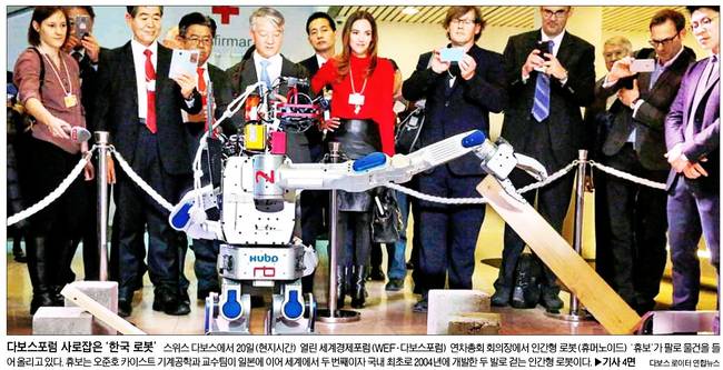 서울신문은 스위스 다보스에서 20일 열린 세계경제포럼 연차총회 회의장에서 인간형 로봇(휴머노이드) '휴보'가 팔로 물건을 들어 올리고 있는 장면을 담았다.