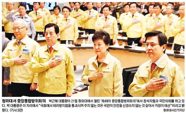 박 대통령은 이 자리에서 "국회에서 테러방지법을 통과시켜 주지 않은 것은 국민의 안전을 신경쓰지 않는 것 같아서 걱정이 태산"이라고 밝혔다. 이어 "생화학무기에 의한 테러, 사이버공격과 같은 새로운 양상의 위협에 대비할 수 있는 시스템 정비가 절실하다"고 말했다.