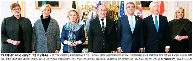 중앙일보는 서방 7개국 국방장관들이 20일(현지시간) 프랑스 파리에서 열린 이슬람국가(IS) 격퇴 회의에서 IS 지역에 대한 공세를 강화하기로 했다며 이들의 사진을 담았다.