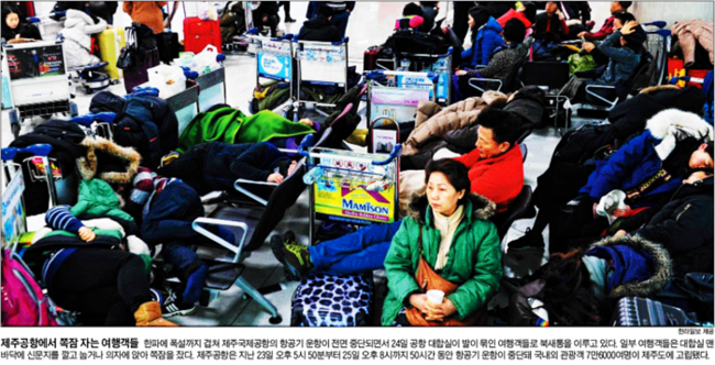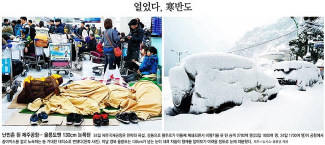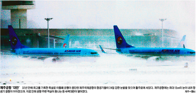 국민일보는 한파·대설·강풍특보로 제주의 항공기 운항이 전면 중단된 24일 항공기가 제주공항에 멈춰서 있는 모습을 1면 사진으로 실었다. 국민일보는 “항공편과 배편이 모두 끊기면서 제주를 찾은 관광객 6만여명의 발이 묶였다”며 “수천명은 공항 대합실에서 이틀째 밤을 지새우며 운항 재개를 기다렸다”고 보도했다.