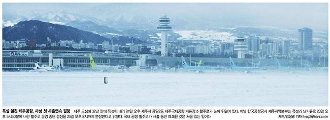 한겨레도 제주국제공항 계류장과 활주로가 눈에 뒤덮여 있는 모습을 1면 사진으로 전했다. 한겨레는 “이날 한국공항공사 제주지역본부는 폭설과 난기류로 23일 오후 5시50분에 내린 활주로 운영 중단 결정을 25일 오후 8시까지 연장한다고 밝혔다”며 “국내 공항 활주로가 사흘 동안 폐쇄된 것은 처음 있는 일”이라고 보도했다.