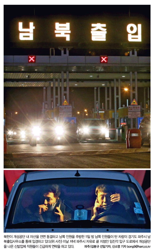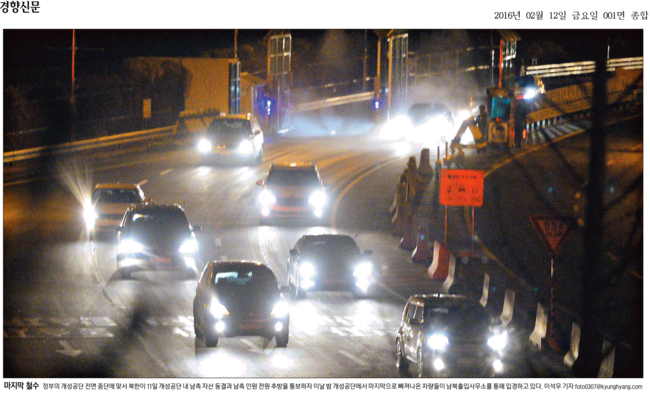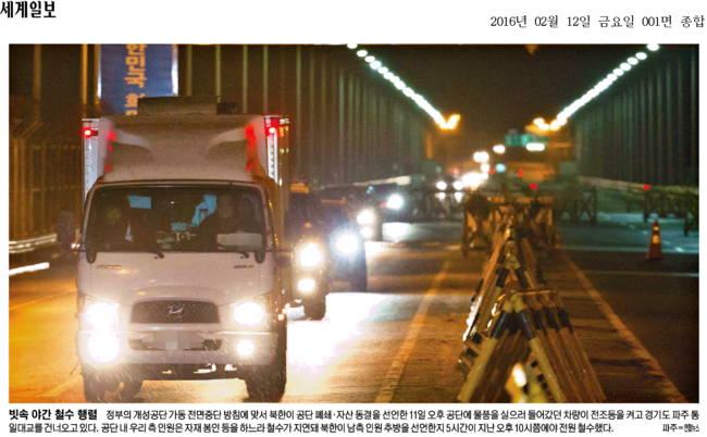 세계일보 또한 ‘빗속 야간 철수 행렬’이라는 1면 사진 설명을 통해 “공단이 물품을 실으러 들어갔던 차량이 전조등을 켜고 경기도 파주 통일대교를 건너오고 있다”며 “공단 내 우리 측 인원은 자재 봉인 등을 하느라 철수가 지연돼 북한이 남측 인원 추방을 선언한지 5시간이 지난 오후 10시쯤에야 전원 철수했다”고 밝혔다.