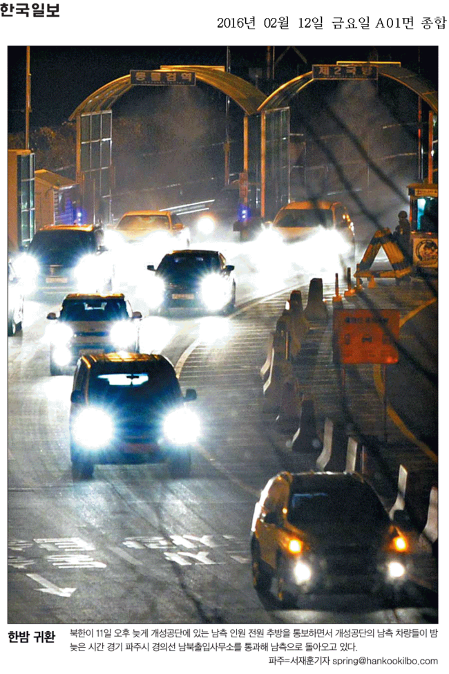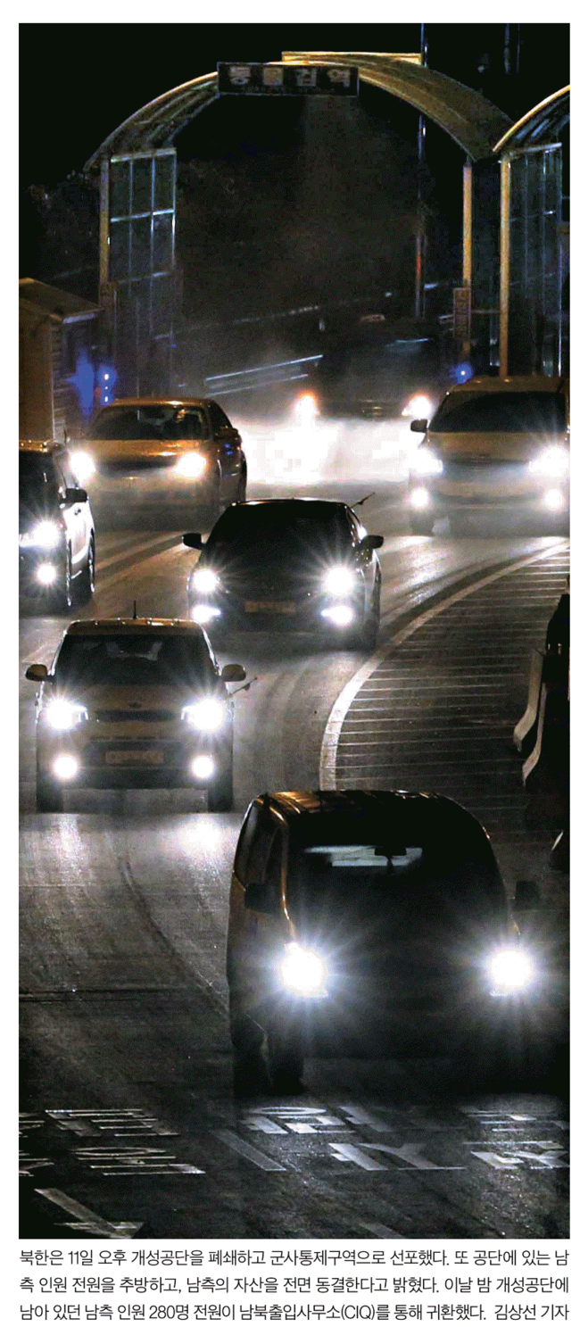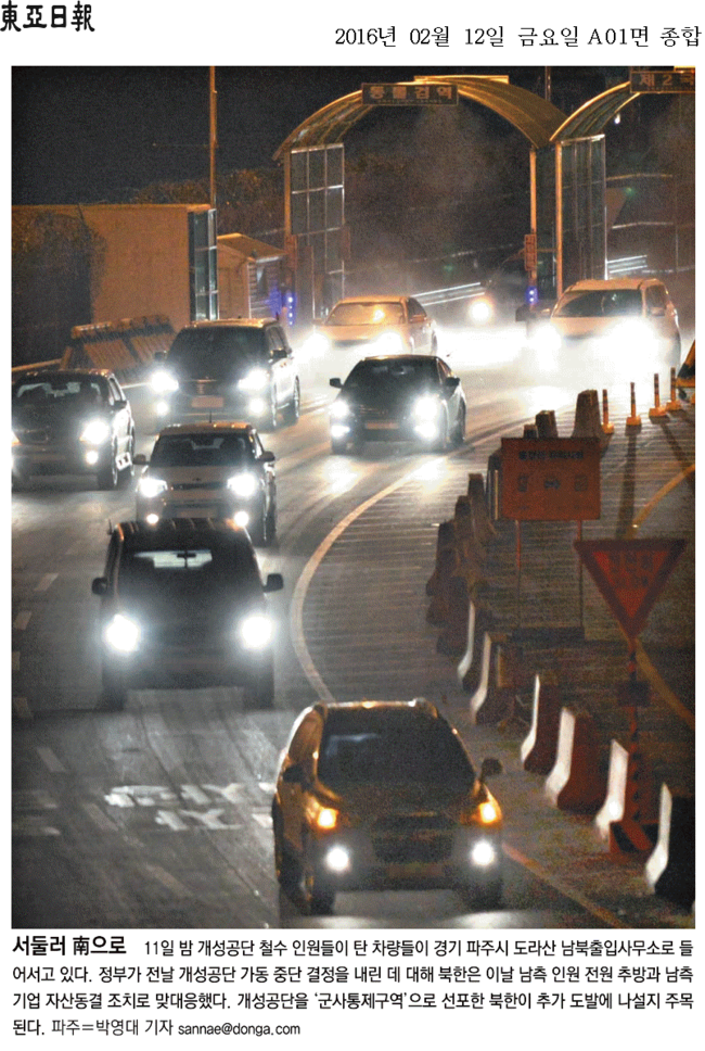 동아일보는 경주 파주시 도라산 남북출입사무로로 들어서는 개성공단 철수 차량들의 행렬을 1면 사진에 담으며 “개성공단을 군사통제구역으로 선포한 북한이 추가 도발에 나설지 주목된다”고 했다.