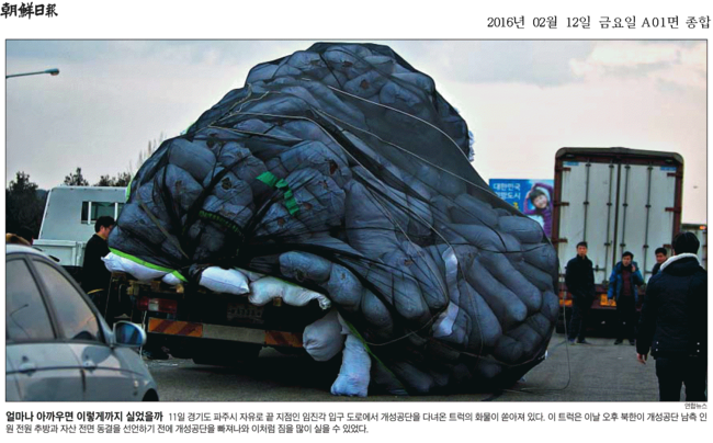 조선일보는 파주시 자유로 끝 지점인 임진각 입구 도로에서 개성공단을 다녀온 트럭의 화물이 쏟아져 있는 모습을 1면 사진으로 보도하며 “이 트럭은 이날 오후 북한이 개성공단 남측 인원 전원 추방과 자산 전면 동결을 선언하기 전에 개성공단을 빠져나와 많은 짐을 실을 수 있었다”고 다급한 상황을 설명했다.