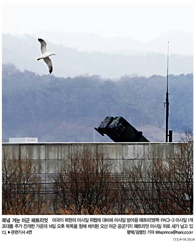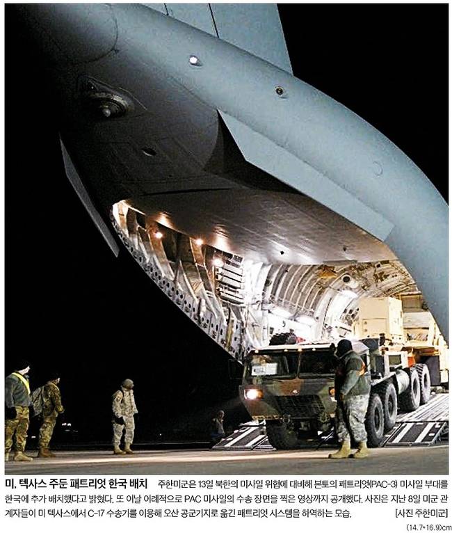 한국일보는 미군이 지난 8일 본토로부터 가져온 패트리엇 미사일 시스템을 오산 공군기지에 하역하고 있는 모습을 1면 사진으로 선정했다. 한국일보는 관련기사에서 “통일부는 이날 입장자료를 내고 ‘북한은 당·정·군이 나서 외화를 벌어들이고 있으며, 이러한 외화는 당39호실과 당서기실에 보관돼 핵 미사일 개발 및 치적 사업, 사치품 구입 등에 사용되는 것으로 파악된다’고 말했다”고 전했다. 그러면서 “하지만 2013년 북한의 3차 핵실험 이후 채택된 유엔 안보리 대북제재 결의 제2094호는 북한의 대량살상무기(WMD)개발에 도움이 되는 금융과 현금의 제공을 금지하고 있다. 정부의 이날 발표는 결국 개성공단 자금 전용을 통한 북한의 유엔 결의 위반을 우리 정부가 묵인해왔다고 인정한 셈”이라고 덧붙였다.
