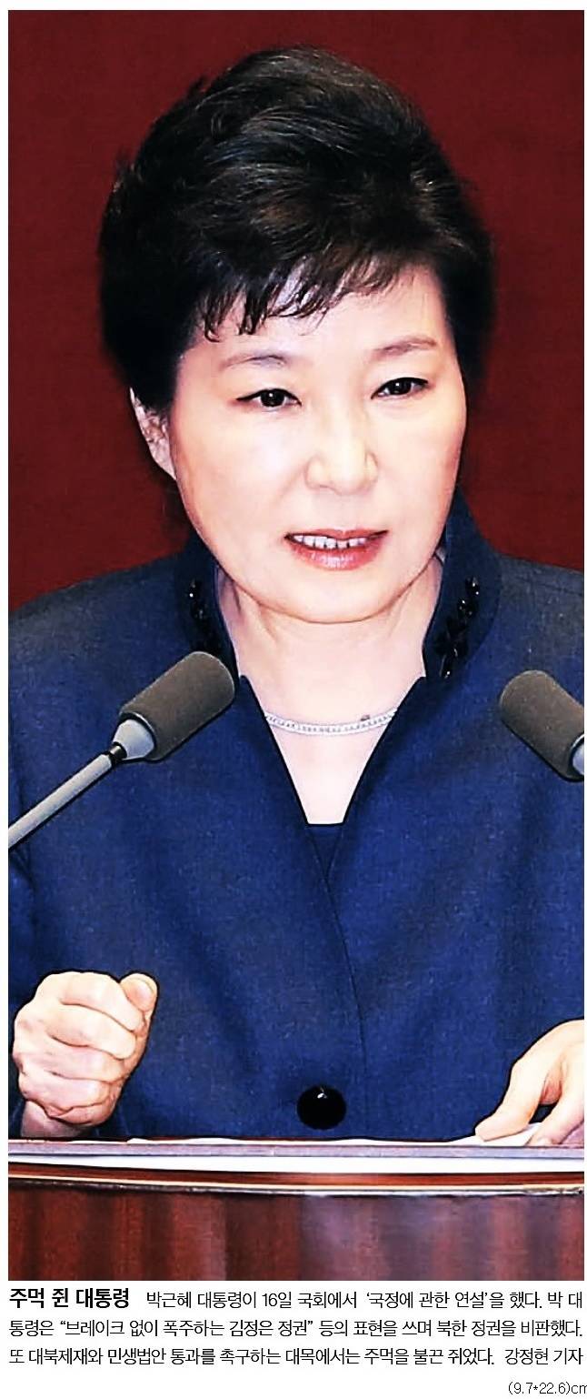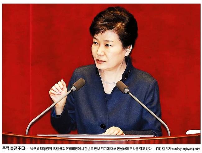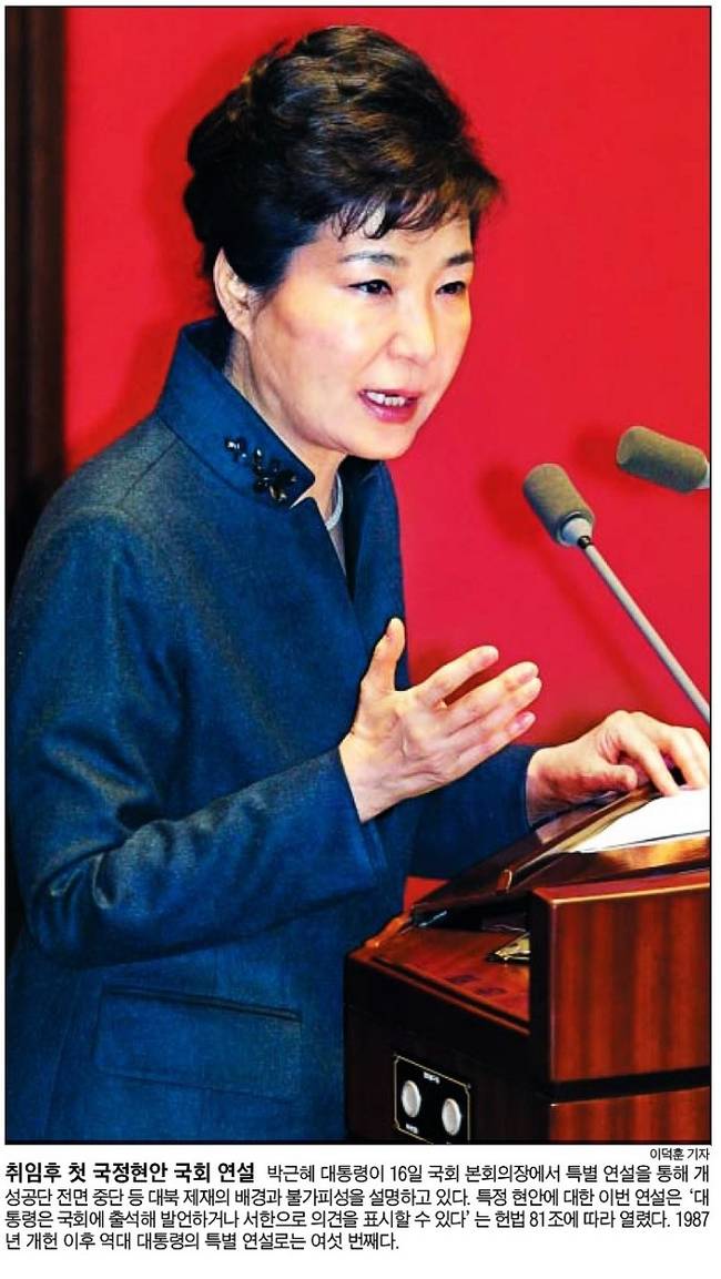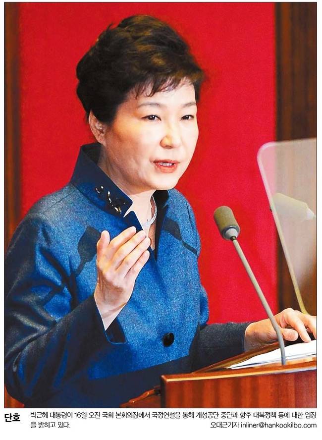 박근혜 대통령이 16일 국회에서 가진 대국민연설에서 압박과 제재로 북한의 핵무장을 포기시키고 김정은 정권을 실질적으로 변화시키는 것을 골자로 하는 ‘신 대북 독트린’을 제시했다. 대화·협상, 교류협력을 배제하고 북한의 변화를 이끌어내겠다는 선언으로, 대북정책의 초강경 기조 선회를 공식화한 것으로 보인다. 17일 모든 주요 일간지들은 대국민연설 중인 박 대통령의 모습을 1면에 내걸었다.