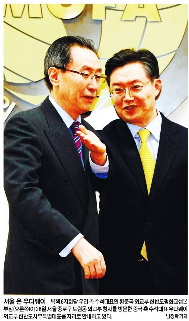 북핵 6자회담 중국 측 수석대표인 우다웨이 외교부 한반도사무특별대표가 28일 우리 측 수석대표인 황준국 외교부 한반도평화교섭본부장과 회동했다.