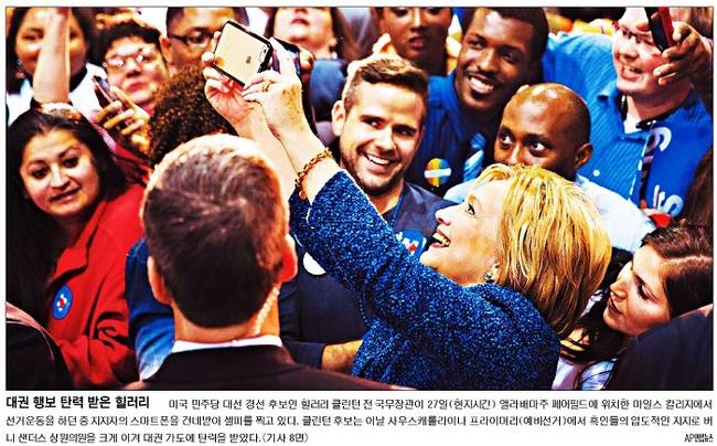 국민일보는 클린턴이 27일 엘라배마 주 페어필드에 위치한 마일스 칼리지에서 선거운동을 하던 중 지지자의 스마트폰을 건네받아 셀피를 찍고 있는 모습을 1면 사진으로 전했다. 국민일보는 “클린턴 후보는 이날 사우스캐롤라이나에서 흑인들의 압도적인 지지로 버니 샌더스 상원의원을 크게 이겨 대권 가도에 탄력을 받았다”며 “4차례 경선에서 가장 큰 표차로 승리를 거둔 클린턴은 비로소 민주당의 ‘대세 후보’다운 면모를 과시했다”고 보도했다.