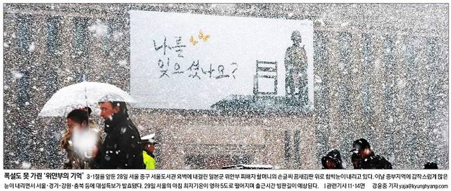 경향신문은 3·1절을 앞둔 28일 서울 중구 서울도서관 외벽에 내걸린 일본군 위안부 피해자 할머니의 손글씨 꿈새김판 위로 함박눈이 내리고 있는 모습을 1면 사진으로 전했다. 경향신문은 “29일 서울의 아침 최저기온이 영하 5도로 떨어지며 출근시간 빙판길이 예상된다”며 “전국에 꽃샘추위가 찾아올 것으로 전망된다”고 보도했다.