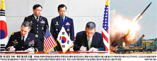 미국 고고도미사일방어체계 사드(THAAD)의 한반도 배치를 논의할 한·미 공동실무단이 4일 실무단 구성 및 운영에 대한 약정을 체결하고 공식적인 협의에 들어갔다. 일부 신문은 관련 사진을 1면에 실었다.