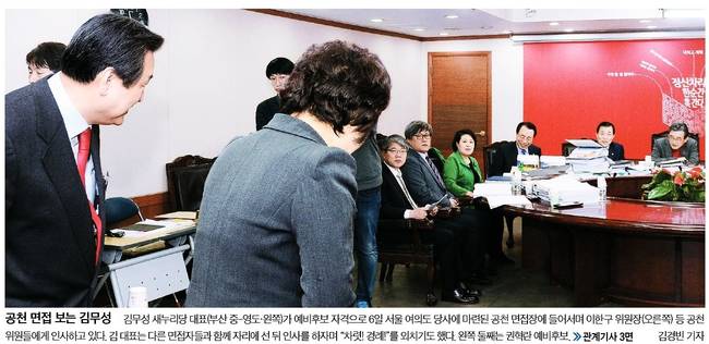 김무성 새누리당 대표가 6일 부산 중·영도구 예비후보 자격으로 공천관리위원회 면접에 참여했다. 7일 동아일보, 서울신문, 세계일보, 중앙일보, 한국일보 등은 면접장에 들어서는 김 대표의 모습을 1면 사진에 담았다.