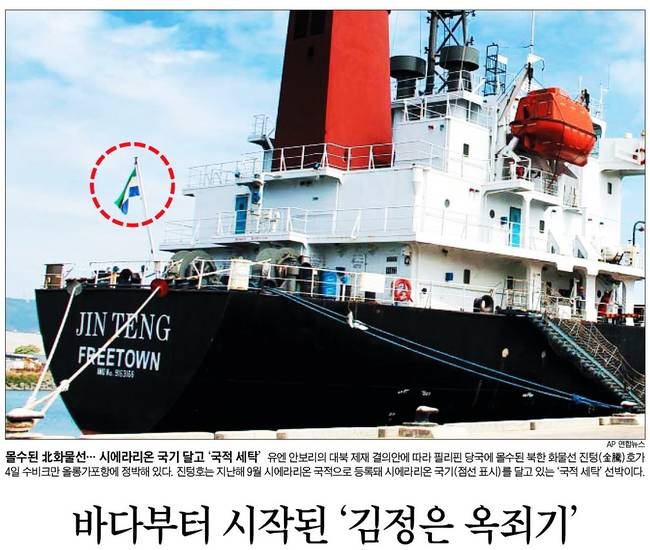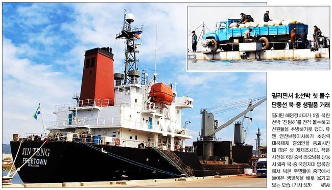 국민일보와 조선일보는 5일 필리핀 해양경비대가 몰수하고 선원들을 추방키로 한 북한 선박 '진텅호'의 모습을 1면에 실었다. 이는 유엔 안전보장이사회가 초강력 대북제재 결의안을 통과시킨 데 따른 첫 제재조치다.