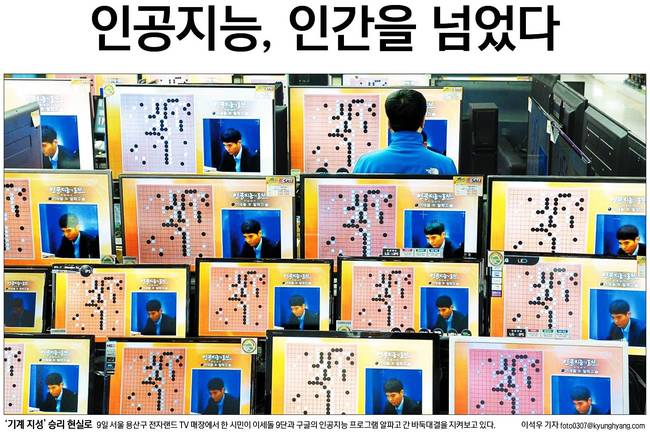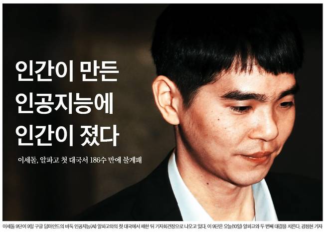 이세돌 9단이 알파고에 충격패를 당했다. 이 9단은 9일 구글의 인공지능 프로그램 알파고와의 제1국에서 불계패했다. 10일 종합일간지들은 "인간이 인공지능에 졌다"면서 일제히 이 9단의 모습을 1면 사진에 담았다.