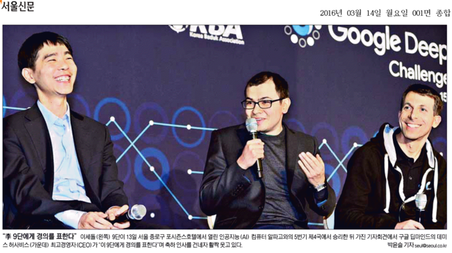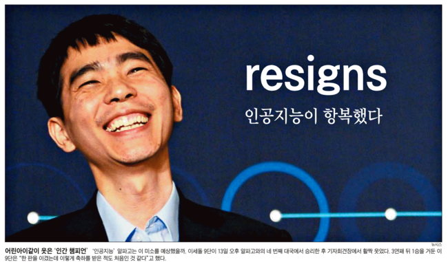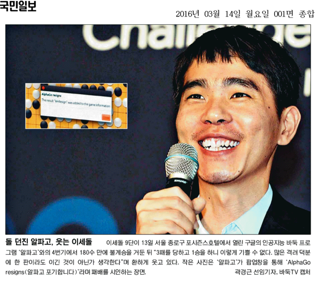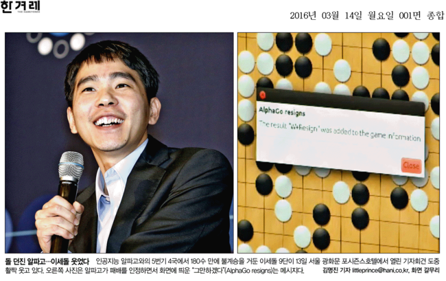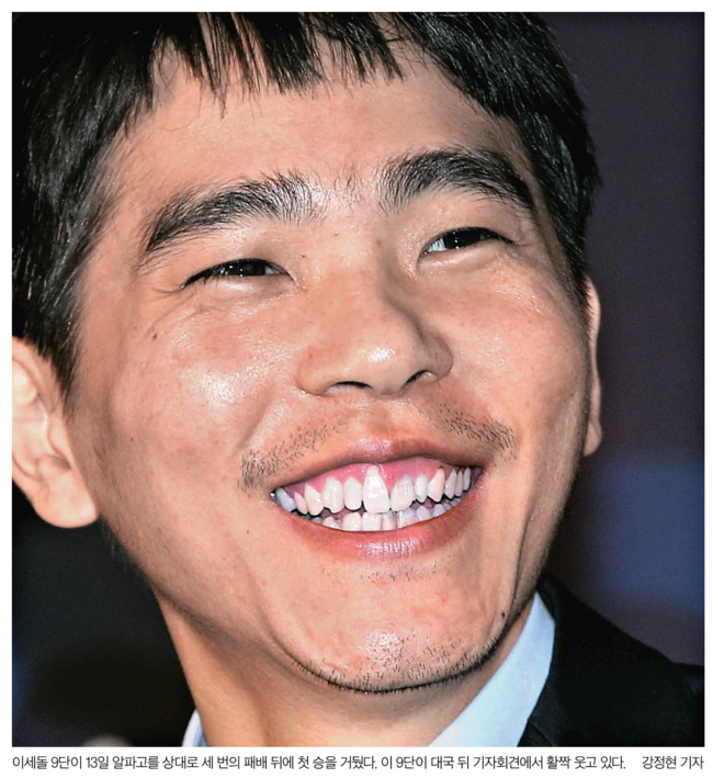 한겨레신문은 “알파고가 패배를 인정하면서 ‘그만하겠다’는 메시지를 팝업창을 통해 알렸다”며 활짝 웃는 이9단의 모습과 대비되는 사진을 1면으로 보도했다. 한겨레는 “기계를 이겨야 하겠다는 이 9단의 승부욕이 통했고 기계도 완벽하지는 않다는 점이 드러났다”며 “중앙에서 백의 활로를 연 이 9단은 막판 초읽기 상황에서도 신중하게 경기를 운영해 승리를 거뒀다”고 했다.