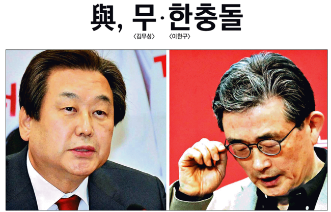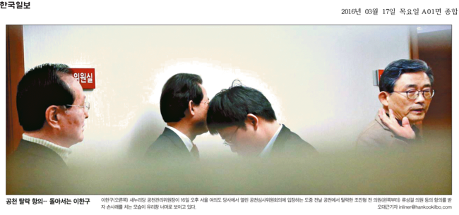 세계일보도 “김 대표와 이 위원장이 현역 의원들을 겨냥한 물갈이 공천 결과를 놓고 충돌했다”며 4.13 총선에서 배제된 주호영 의원이 김 대표의 손을 잡으며 억울함을 호소하고 있는 사진을 1면에 실었다. 세계는 “김 대표가 공관위의 전날 단수 후보 결정에 재의를 요구했지만 이 위원장이 일축했다”고 밝혔다.