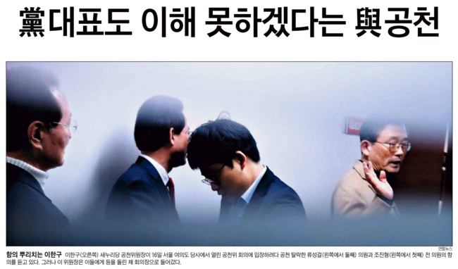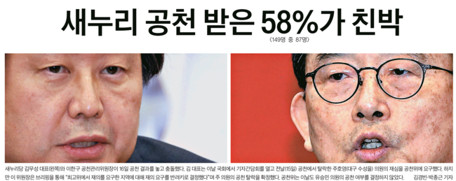 17일 국민일보, 세계일보, 조선일보, 중앙일보 등 대다수의 조간신문은 새누리당의 공천 관련 소식을 1면 사진에 담았다.