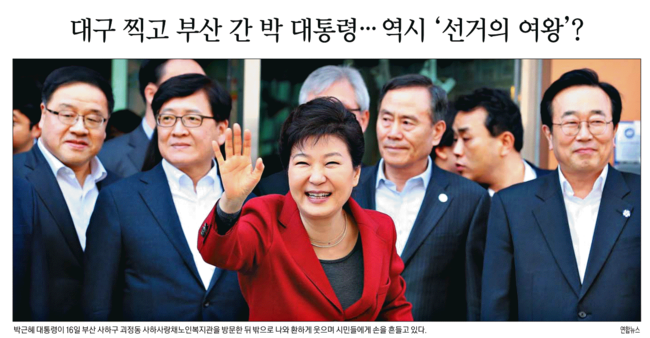 경향신문과 동아일보, 서울신문은 이날 대구와 부산을 방문한 박근혜 대통령의 소식을 1면으로 보도했다. 경향은 “박 대통령이 부산창조경제혁신센터를 방문한 것은 개소 1주년을 맞아 주요 성과를 점검한다는 명목이었지만 부산 지역에 출마한 친박 후보들에게 힘을 싣는 등 사실상 선거유세에 나선 것이라는 해석이 나왔다”고 밝혔다.