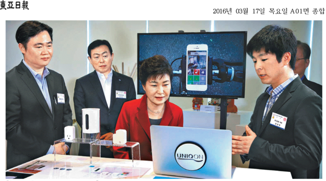 동아일보도 부산창조경제혁신센터를 방문한 박 대통령이 신동빈 롯데그룹 회장 등과 함께 기업의 스마트홈 제품에 대해 설명을 듣고 있는 모습을 1면에 실으며 “최근 박대통령의 연이은 지방 방문을 두고 야당은 선거 개입 의혹을 제기하며 반발하고 있다”고 설명했다.