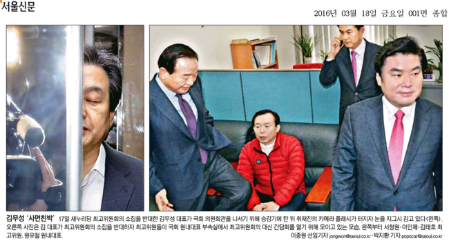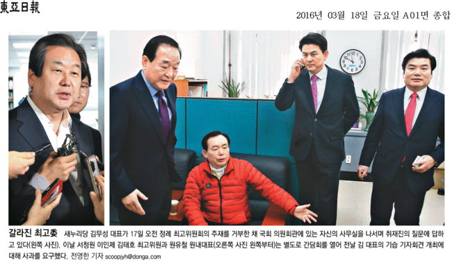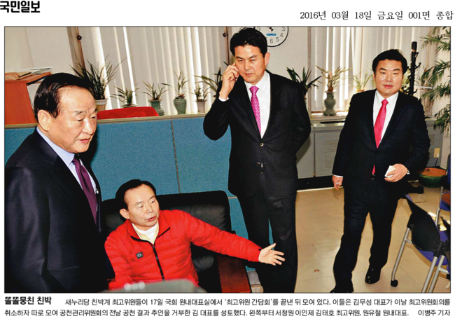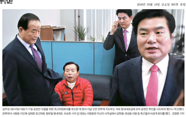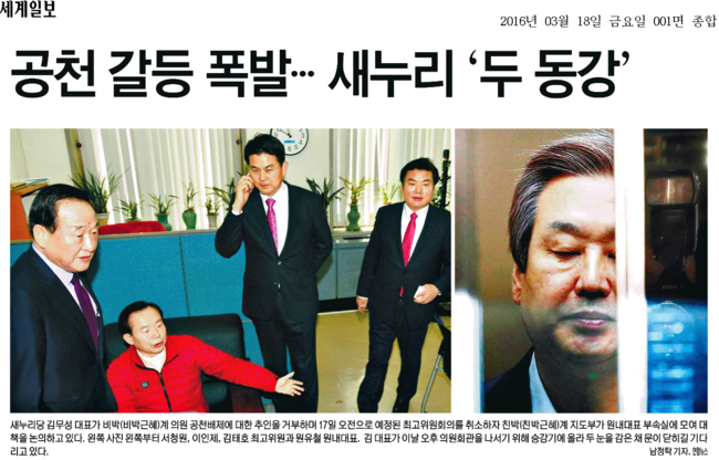 새누리당 비박계 인사들의 공천 탈락에 대한 최고위원회의 추인을 두고 계파 갈등이 전면으로 불거지고 있다. 18일 국민일보와 동아일보, 서울신문, 세계일보 등 대다수의 조간신문은 두 동강난 여당의 갈등 모습을 1면 사진으로 보도했다.