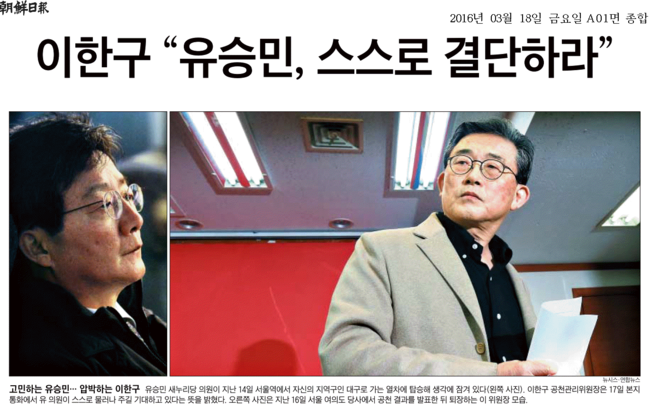 이날 조선일보와 한국일보는 공천 갈등과 관련해 유승민 의원에 주목했다. 조선일보는 "이한구 위원장이 아직 공천 여부에 관해 결론을 내지 못하고 있는 유승민 의원에 대해 '스스로 결단을 내리기를 기다리고 있다. 본인이 하지 못하면 곧 공천위가 결단할 것'이라고 말했다"고 전했다. 조선은 "새누리당의 공천 심사는 1주일 만에 또다시 중단됐다. 당 최고 의사 결정 기구인 최고위원회의도 파행을 겪으며 당은 사실상 마비 상태가 됐다"고 덧붙였다.