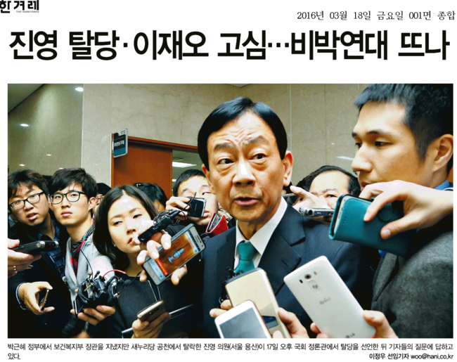 한겨레신문은 공천에서 배제된 진영의원의 탈당 소식을 전했다. 한겨레는 진 의원이 인터뷰를 통해 "20년간 열정적으로 몸담았던 새누리당을 떠나려고 한다. 오직 국민 편에서 일하겠다는 국민과의 약속을 지키려 했던 지난날 저의 선택이 오늘 저에게 이처럼 쓰라린 보복을 안겨줬다"고 전했다.