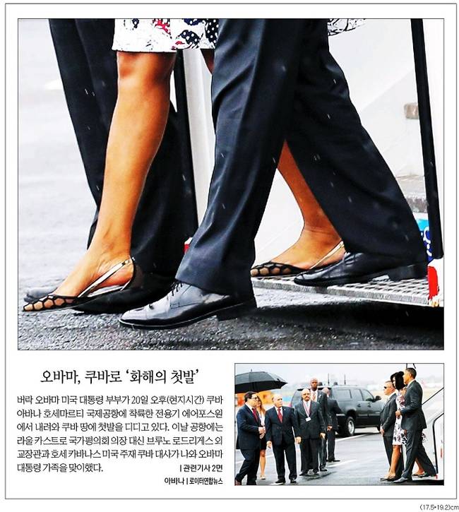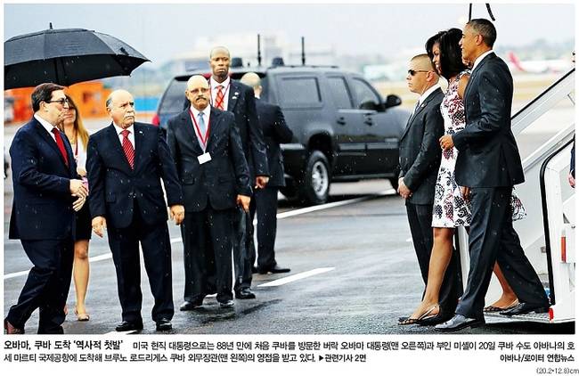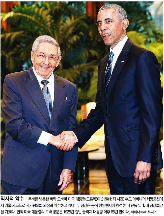 동아일보는 쿠바를 방문한 오바마 대통령이 라울 카스트로 국가평의회 의장과 악수를 하는 모습을 1면 사진으로 선택했다.