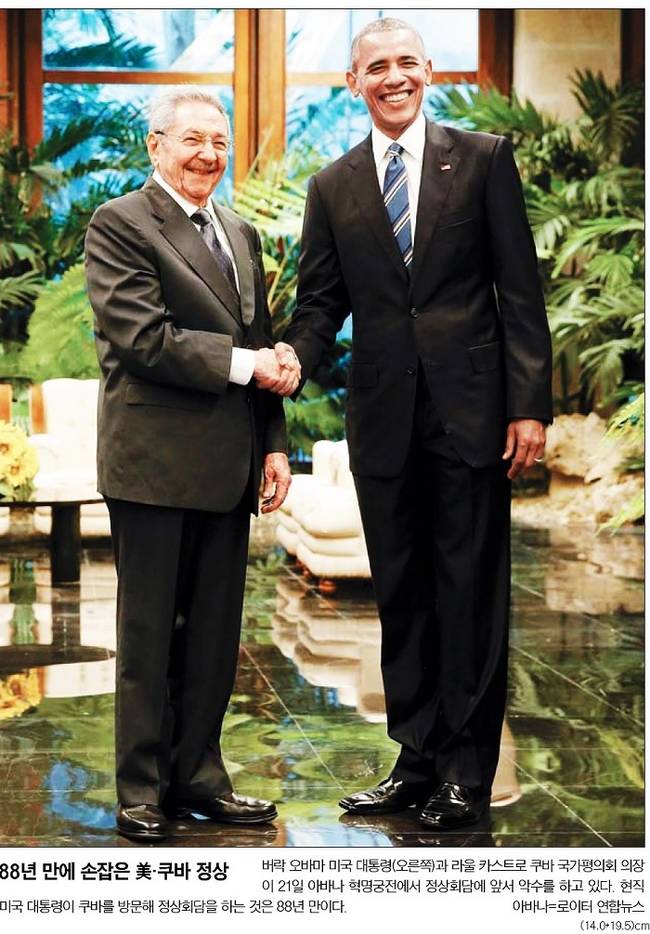 버락 오바마 미국 대통령이 현직으로는 88년 만에 쿠바를 방문해 21일(현지시간) 라울 카스트로 쿠바 국가평의회 의장과 수도 아바나 혁명궁전에서 정상회담을 가졌다. 이로써 오바마 대통령은 2014년 12월 쿠바와의 적대관계를 청산하고 국교 정상화를 추진한 지 1년 3개월 만에 중남미에서 냉전의 마지막 흔적 제거라는 새로운 역사를 얻었다는 평가를 받고 있다. 하지만 쿠바 정부가 민감해 하는 인권 문제가 양국 정상회담 의제로 오르는 등 미주 대륙의 마지막 냉전구도를 허물기 위한 역사적 행보가 순탄치만은 않았다. 22일 모든 주요 일간지들은 오바마 대통령의 쿠바 방문과 정상회담과 관련된 소식을 신문 전면에 내걸었다.
