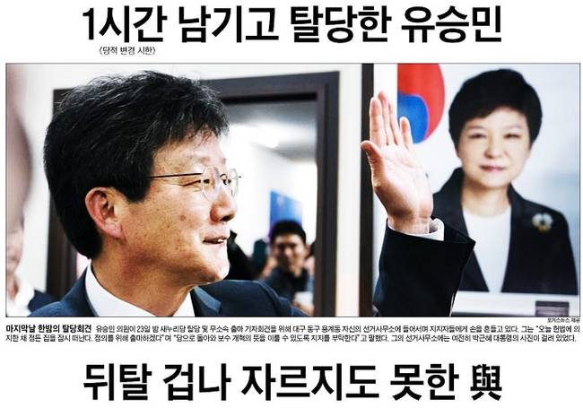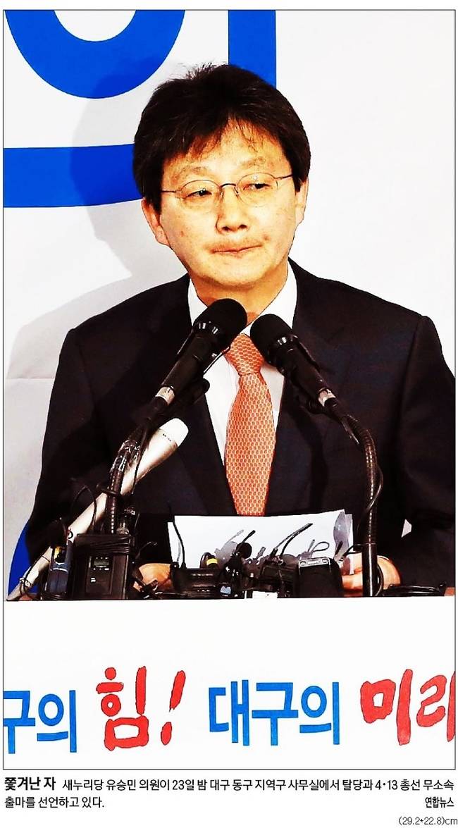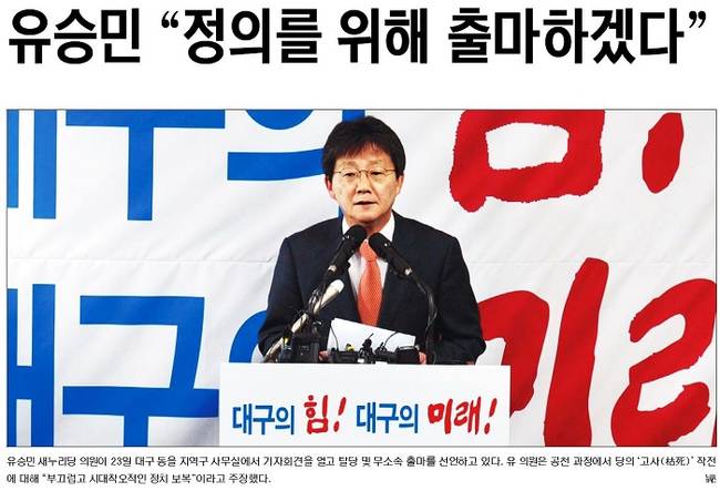 국민일보는 기자회견을 열고 탈당과 무소속 출마를 선언하는 유 의원의 모습을 1면에 내걸었다.