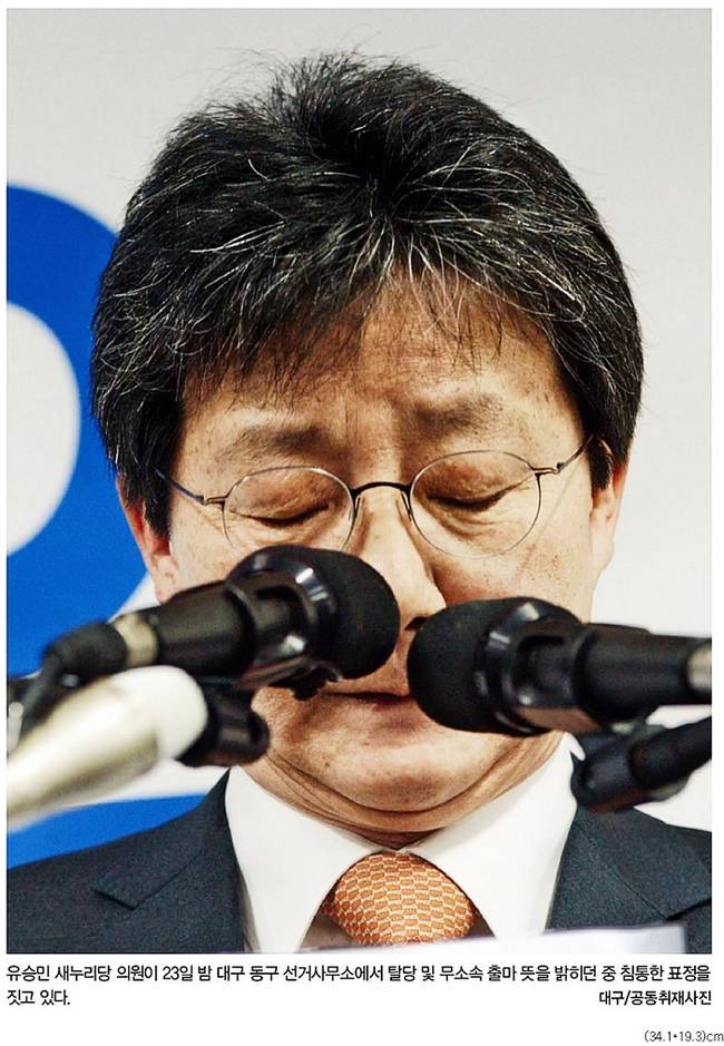 새누리당 공천 갈등의 핵이었던 유승민 의원(대구 동구을)이 당적 변경 마감시한인 23일 밤 탈당과 무소속 출마를 선언했다. ‘TK(대구·경북) 현역의원 공천학살’에 따른 비판 여론이 거세고, 여당 공천 탈락자의 무소속 연대도 탄력이 붙을 것으로 보이면서, 유 의원의 무소속 출마는 20대 총선의 중대 변수가 될 전망이다. 24일 거의 모든 주요 일간지들은 이 같은 소식과 관련된 사진을 신문전면에 내세웠다.