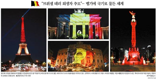 한국일보는 이날 벨기에 브뤼셀에서 연쇄테러 발생 후 세계주요 도시에서 희생자들을 추모하기 위해 건축물에 벨기에 국기색의 조명을 비춘 모습을 전면에 내걸었다.
