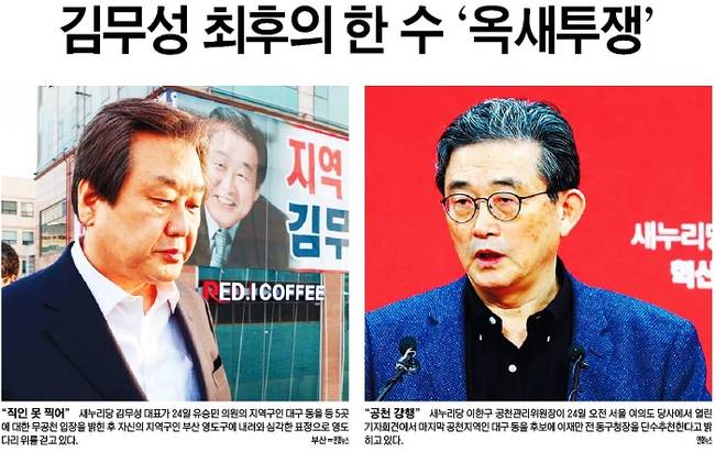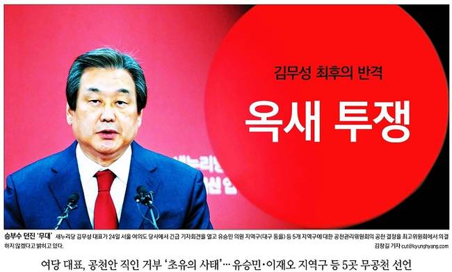 김 대표의 ‘초강경 반격’에 친박계는 대표 끌어내리기로 맞서고 있다. 전날 탈당을 선언한 유승민 의원 ‘밀어내기’로 폭발한 여권의 공천 내전이 총선이 본격화하는 시점에 계파 간 전면전으로 번지게 됐다. 25일 거의 모든 주요 일간지들은 이와 관련한 소식을 신문 1면에 내걸었다.