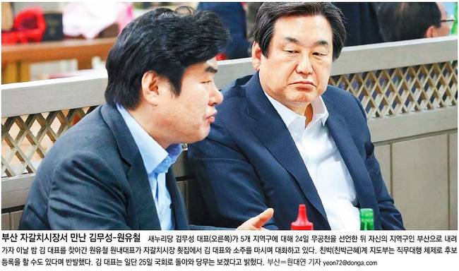 동아일보는 이날 밤 김 대표를 찾아간 원유철 원내대표가 자갈치시장 횟집에서 김 대표와 소주를 마시며 대화하는 모습을 대문사진으로 선택했다.