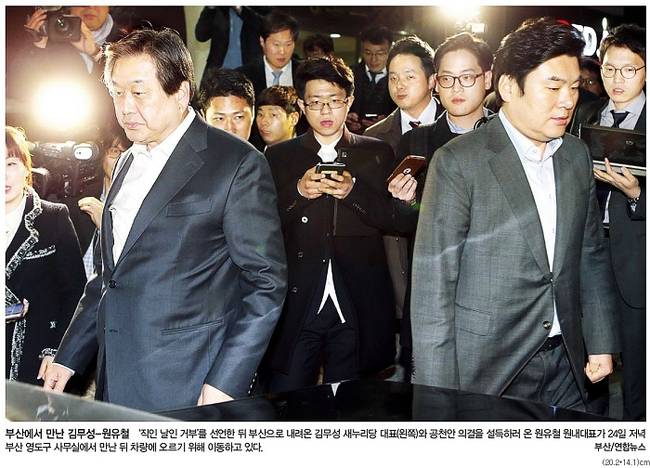 한겨레신문은 부산에서 만난 김 대표와 원 원내대표가 만난 뒤 차량에 오르기 위해 이동하는 모습을 1면에 내걸었다.