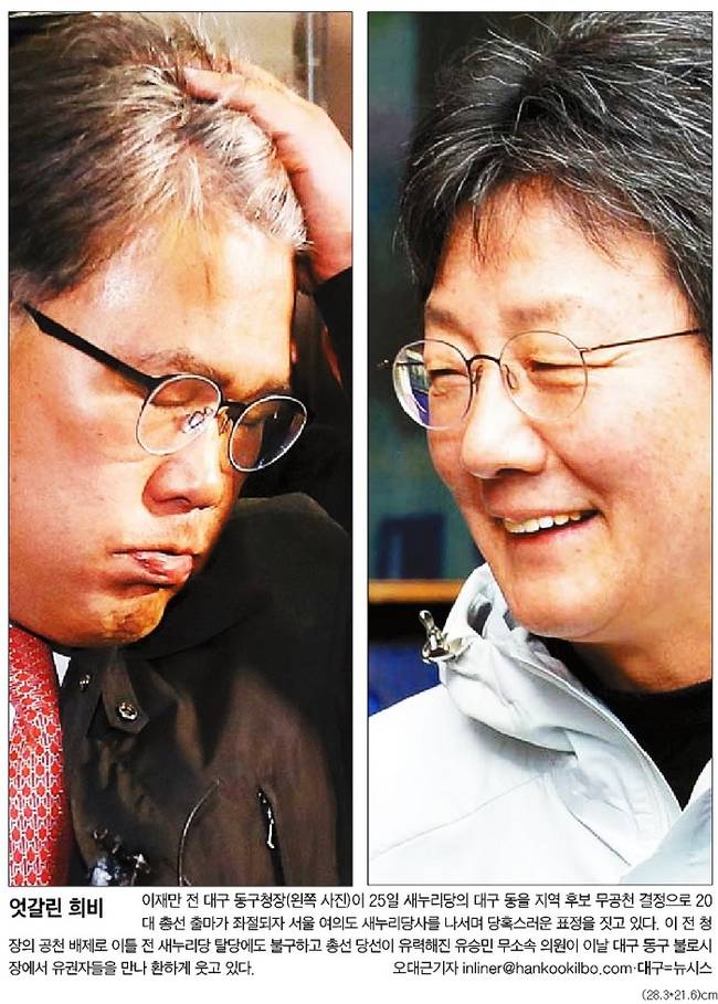 한국일보는 이재만 전 대구 동구청장이 새누리당의 대구 동을 지역 후보 무공천 결정으로 20대 총선출마가 좌절되자 서울 여의도 새누리당사를 나서며 당혹스러워하는 표정을 짓는 모습과 탈당에도 당선이 유력해진 유승민 무소속 의원이 유권자들을 만나 환하게 웃는 모습의 사진을 나란히 걸었다.