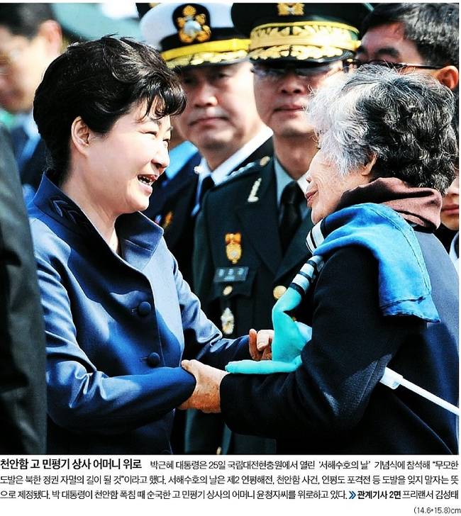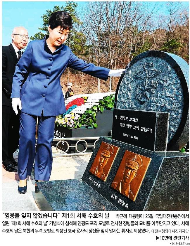 국민일보, 동아일보, 세계일보, 조선일보, 중앙일보는 25일 박근혜 대통령이 국립대전현충원에서 열린 ‘서해수호의 날’ 기념식에 참가한 모습을 전면에 내걸었다.