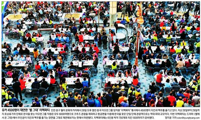 이번 치맥파티는 드라마 '별에서 온 그대'에서 주인공이 치킨과 맥주를 즐기는 장면을 그대로 재연해보자는 뜻에 마련됐다. 치맥파티에는 6인용 탁자 750개와 치킨 1500마리가 준비됐다.