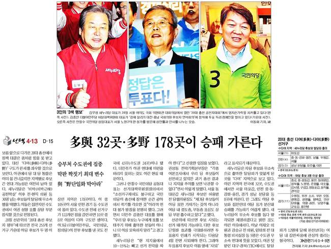 국민일보는 "보름 앞으로 다가온 20대 총선에서 정책 대결은 좀처럼 힘을 못 받고 있는 대신 '다여‧다야'구도가 판세를 좌우할 것"이라고 분석했다.