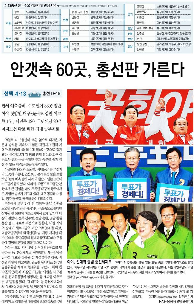 동아는 "29일로 4.13총선이 15일 앞으로 다가온 가운데 승부를 예측하기 힘든 격전지가 전체 지역구(253곳)의 4분의 1에 달하는 것으로 집계됐다"고 보도했다.