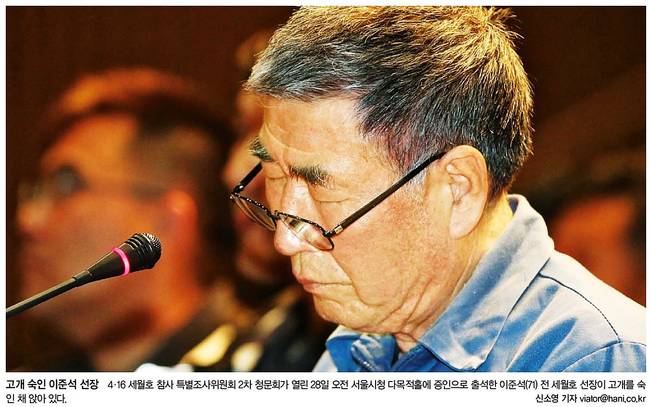 한겨레는 4.16세월호 창사 특별조사위원회 2차 청문회가 열린 28일 오전 서울시청 다목적홀에 증인으로 출석한 이준석 전 세월호 선장이 고개를 숙인 채 앉아 있는 장면을 담았다.