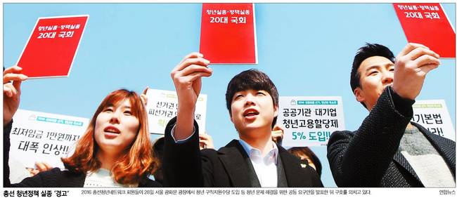 한국일보는 2016 총선청년네트워크 회원들이 28일 서울 광화문 광장에서 청년 구직지원수당 도입 등 청년 문제 해결을 위한 공동 요구안을 발표한 뒤 구호를 외치고 있는 장면을 담았다.