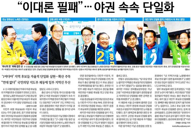 경향신문은 30일자 1면 사진으로 4.13총선을 보름 앞둔 29일 야권 후보들의 단일화가 잇따라 성사된 가운데 경남 창원성산 노회찬(정의당)‧허성무(더불어민주당)후보, 강원 춘천 이용범(국민의당)‧허영(더민주) 후보, 경기 안양동안을 이정국(더민주)‧박광진(국민의당) 후보가 손을 맞잡고 있는 장면을 담았다. 또 전날인 28일 단일화에 합의한 대전 대덕 박영순(더민주)‧김창수(국민의당) 후보도 함께 손을 들어 올리며 총선 승리를 다짐한 장면을 함께 실었다.
