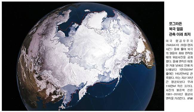 올해 면적은 따뜻한 겨울 날씨로 인해 지난해보다 1만2950㎢ 줄어든 1452만㎢로 관측됐다고 국민일보는 전했다. 이는 지난 30년간 평균치보다 무려 110만㎢ 작은 크기다.