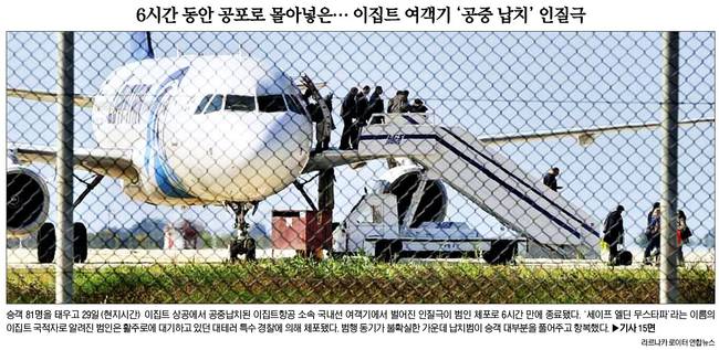 서울신문, 세계일보는 이집트 여객기를 공중 납치한 인질범들이 체포되는 장면을 실었다.