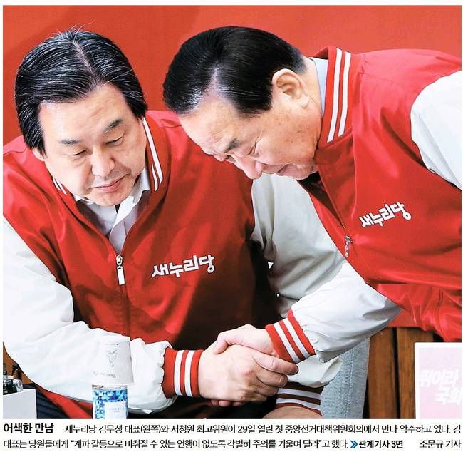 중앙일보는 새누리당 김무성 대표(왼쪽)와 서청원 최고위원이 29일 열린 첫 중앙선거대책위원회에서 만나 악수하고 있는 장면을 담았다.