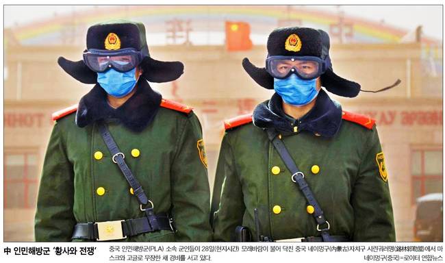 한국일보는 중국 인민해방군(PLA) 소속 군인들이 28일(현지시간) 모래바람이 불어닥친 중국 네이멍구 자치구 시린궈러맹에서 마스크와 고글로 무장한 채 경비를 사고 있는 장면을 실었다.
