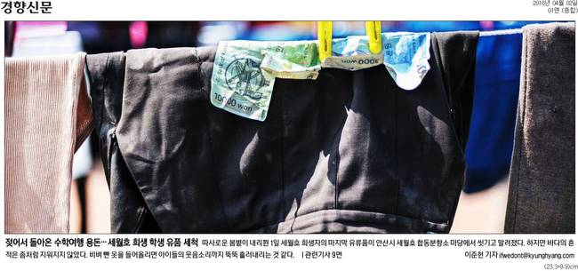 경향신문은 2일자 1면 사진으로 지난 1일 세월호 희생자의 마지막 유류품이 안산시 세월호 합동분향소 마당에서 씻기고 말려지고 있는 장면을 실었다.