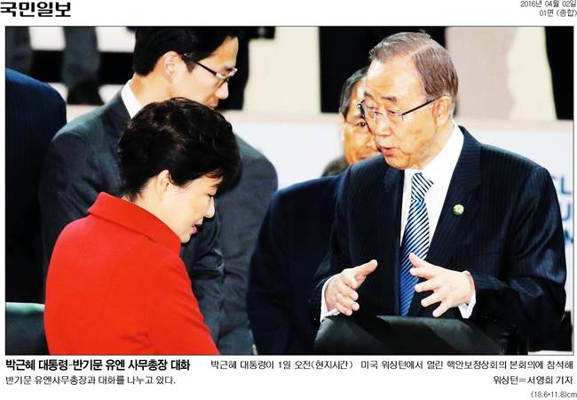 국민일보는 박근혜 대통령이 1일 오전(현지시간) 미국 워싱턴에서 열린 핵안보장상회의 본회의에 참석해 반기문 유엔사무총장과 대화를 나누고 있는 장면을 담았다.